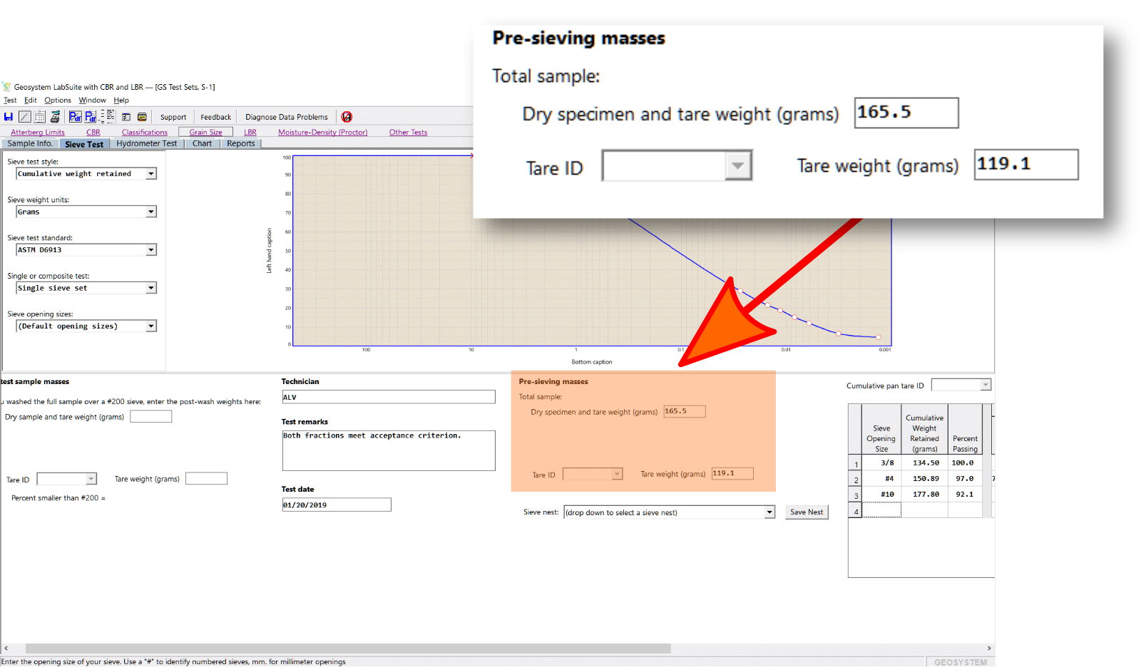 - The mass of the sieve sample. This is entered into the Pre-sieving masses box, shown below: