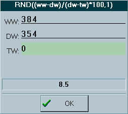 This capability may be used for other calculations (density, for example): make up names for each of the values involved in the calculation (e.g., WW, DW and TW in the example) and enter the resulting equation into the Field type section of the data entry field designated to show the calculation result ("Water content" in our example").