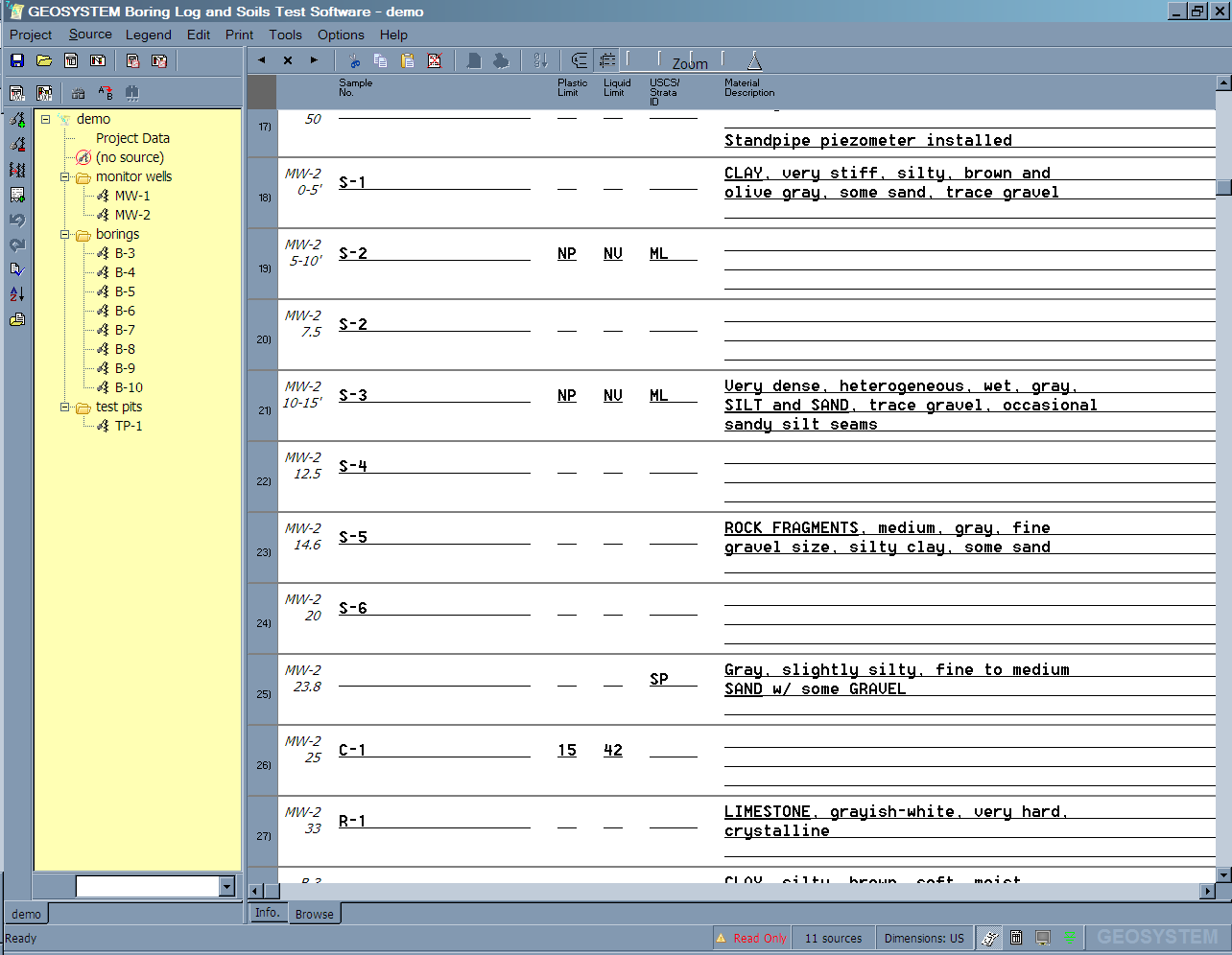 While you're entering data the screen shows just the data for the source you're working on. Once you've entered the data for several sources, you may find that you need to view data from all of your sources at once. As an example, if you have a new soil sample and you'd like to match that sample's properties against the samples you've already entered into the project you'll want to view the sample numbers, Atterberg Limits, USCS or AASHTO classifications and perhaps material descriptions for all of the samples in your project file. LOGDRAFT's browser facility lets you generate and edit lists of data entered into one or more data entry fields, in all of the sources in your project. A list for the example scenario is shown in this figure: