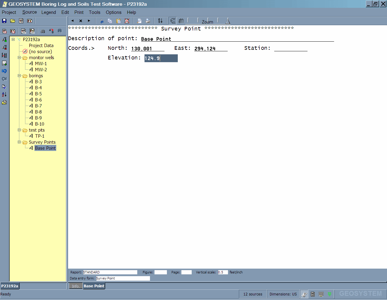 You don't necessarily enter the same types of data for every source: Compare this figure, which shows a typical monitoring well data entry screen, with this figure, which shows the prompts required to enter data for a survey point.