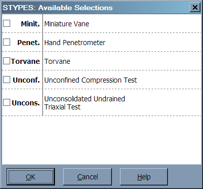 You may want to limit the information entered into certain data entry fields on a LOGDRAFT subsurface table to a small set of choices. As an example, a Shear test type data entry field might be limited to a set of standardized test type labels:Minit. for Miniature VanePenet. for Hand PenetrometerTorvane for TorvaneUnconf. for Unconfined Compression TestUncons. for Unconsolidated Undrained Triaxial Test