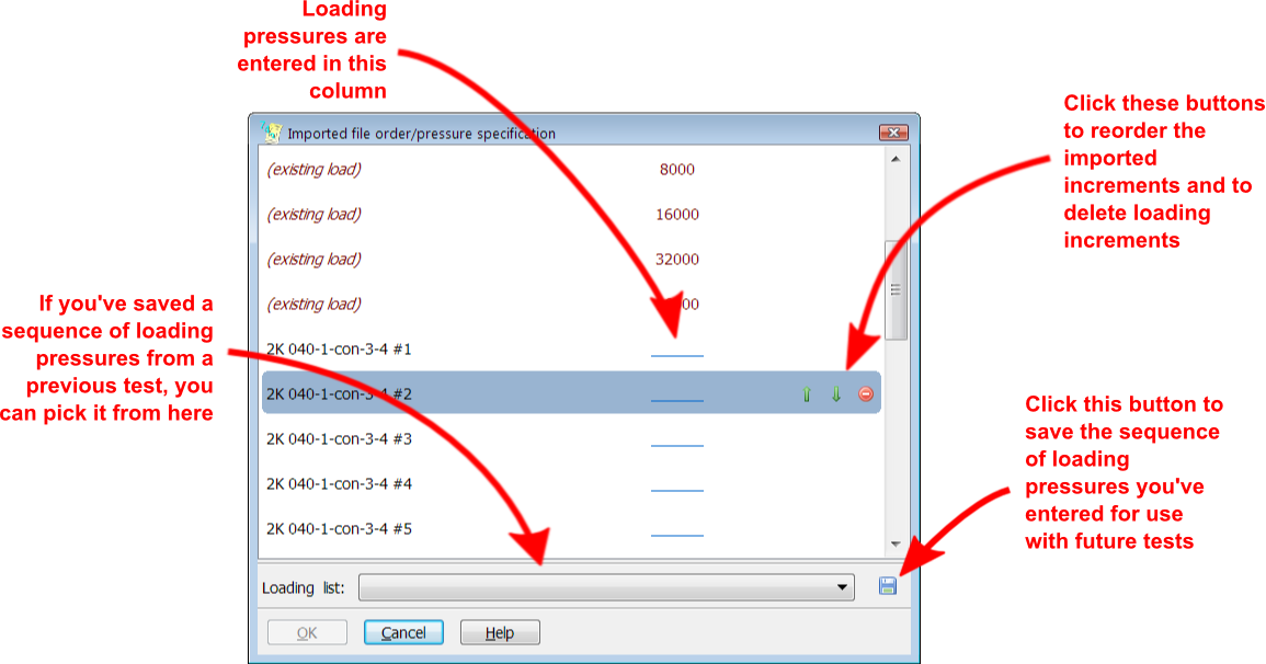 - After you've entered a particular sequence of loading pressures you can save it and apply it to future imports. To do this, click on the button at the right of the Loading list selection box. The next time you import data from a test that used the same loading pressure sequence you can pick the sequence in the Loading list box and the program will fill in the current import's missing loading pressures.
