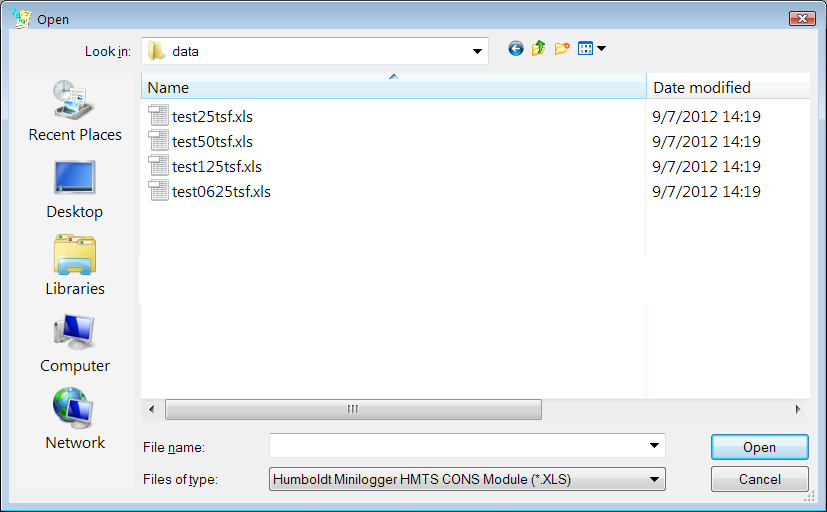 You can import data acquisition files one at a time or import multiple files at once. To start the process, begin by entering your sample and test information, then select Test > Import Data Acquisition File. CONS responds by showing a file selection dialog: