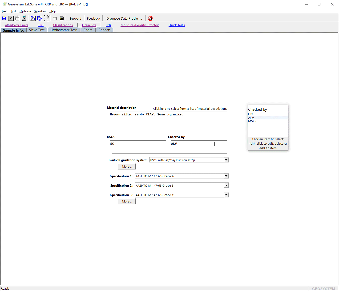 Support for sieve, hydrometer and Atterberg limits tests, along with automatic soil classification via USCS, AASHTO, Burmister and others.