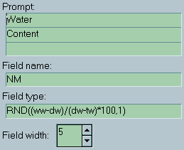 This capability may be used for other calculations (density, for example): make up names for each of the values involved in the calculation (e.g., WW, DW and TW in the example) and enter the resulting equation into the Field type section of the data entry field designated to show the calculation result ("Water content" in our example").