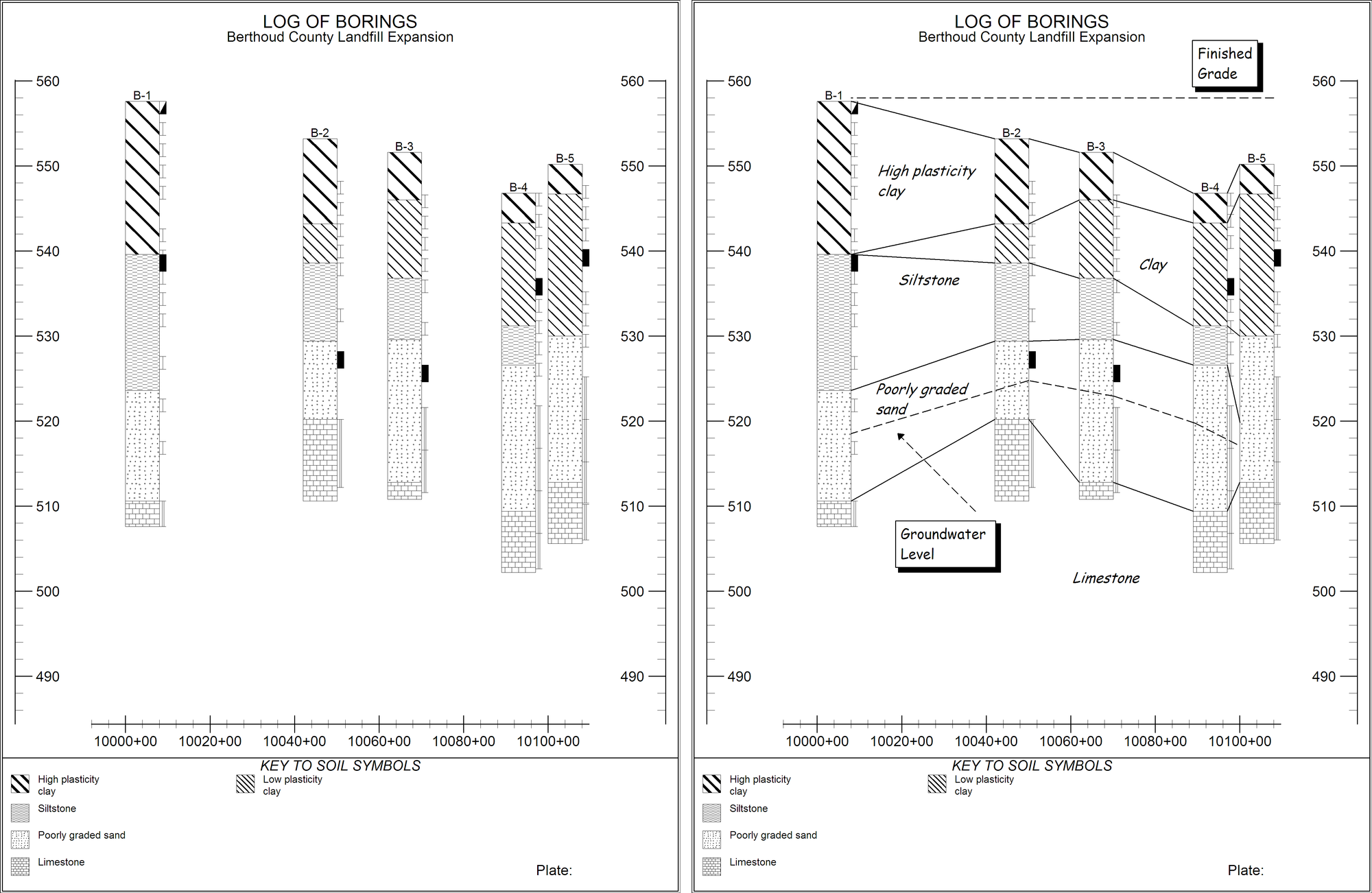 LOGDRAFT's profile forms can be set up to automatically display information concerning the conditions encountered at borings around a site -- this information is usually in the form of a graphic key to the strata layers encountered along with symbols indicating groundwater depths and possibly testing information such as the natural water content of samples recovered from the hole. However, it isn't possible to automatically add information about conditions between borings (for example, there isn't any way to have the program automatically plot the location of an underground storage tank); to compensate for this, LOGDRAFT features a facility for adding annotations to a profile report after it's been plotted on-screen. This allows you to draw and label the strata layers, show how the finished grade will appear relative to the original ground level and show the location and type of any underground structures.
