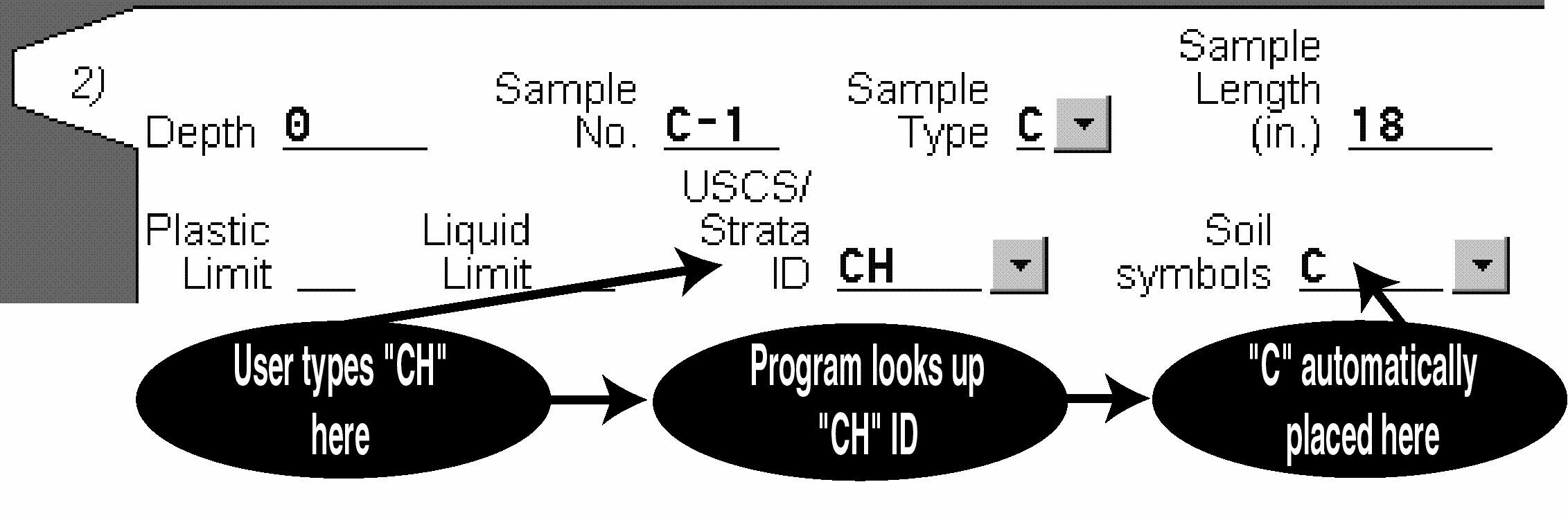 - The STRATA ID prompt allows you to specify a mnemonic that will be used to automatically select a stratigraphy symbol or symbols. Typically, the STRATA list is set up so that USCS classifications are used as strata IDs -- during data entry, when the user enters a USCS classification the program automatically fills in the stratigraphy symbol selection field as illustrated in this figure.